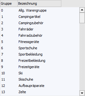 In der Tabelle werden nach Auslösen der Suche (Button "Anzeigen" oder Suchbegriff bestätigen) die gefundenen Gruppen mit ihrer Nummer und Bezeichnung angezeigt. Per Doppelklick oder Enter-Taste kann die ausgewählte Artikelgruppe anschließend in das Ausgangsfenster übernommen werden.
