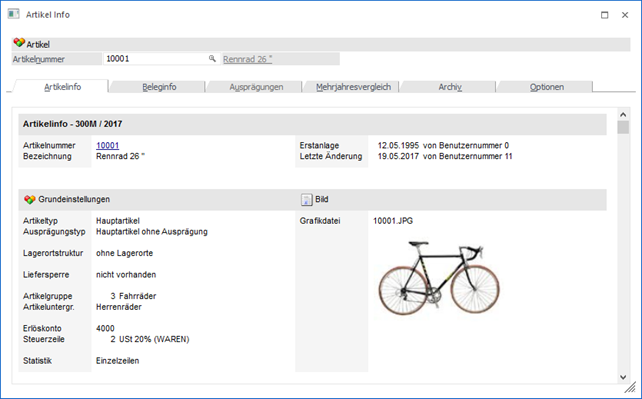Durch Anklicken des Buttons "Artikelinformation" wird das Programm "Artikelinformation" der WinLine INFO geöffnet, wo weitere Daten des gerade gewählten Artikels angezeigt werden.