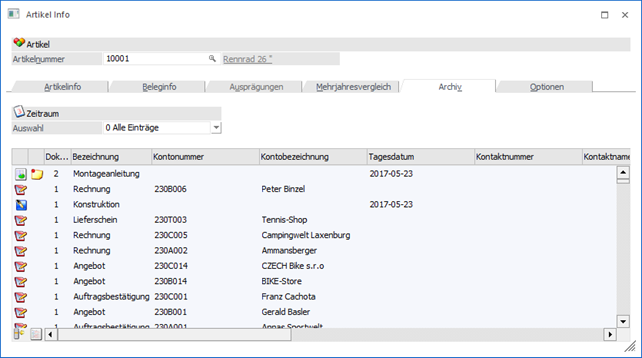 Durch Anwahl des Registers "Archiv" können alle Archiveinträge angesehen werden, die zu diesem Artikel vorhanden sind. Voraussetzung dafür ist, dass das Programm WinLine ARCHIV eingesetzt wird.