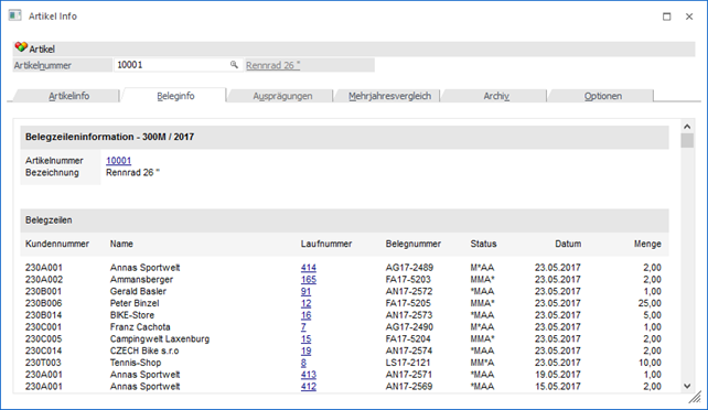 In dem Register "Beleginfo" werden alle Belegzeilen für den gewählten Artikel angezeigt.