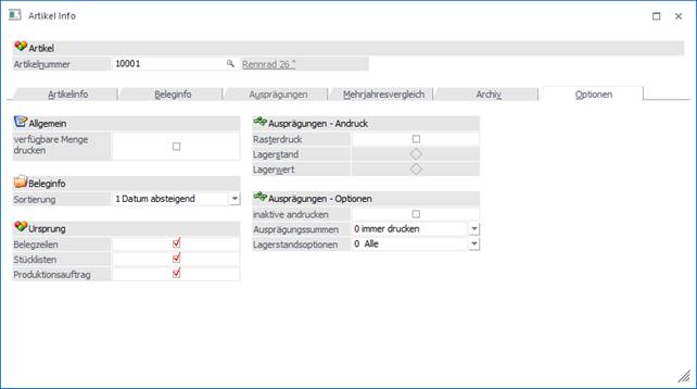 Dabei werden jene Einstellungen berücksichtigt, die im Menüpunkt "Ausprägungsoptionen" angegeben sind.
