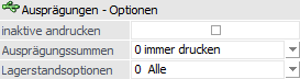 Hier werden alle Ausprägungen angedruckt, deren Lagerstand nicht 0 ist,