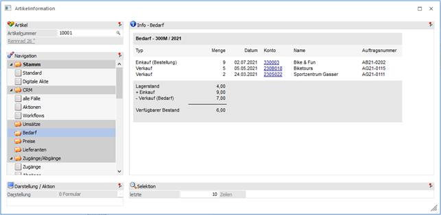 Im Navigationsbereich "Bedarf" wird der Bedarf des Artikels (gemäß der Disposition) angezeigt.