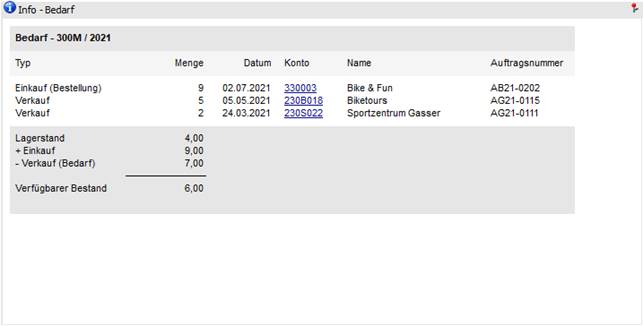 Die Information "Verfügbarer Bestand" berechnet sich aus dem Lagerstand plus dem Einkauf, abzüglich der Verkauf-Dispositionszeilen (Verkauf Bedarf)).