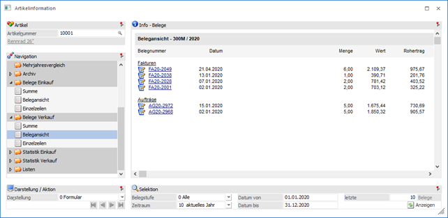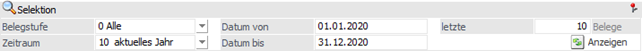 An dieser Stelle werden die Belege, gemäß der nachfolgenden Selektion, dargestellt. Die Art der Anzeige kann mit Hilfe der Option "Darstellung" gewählt werden.