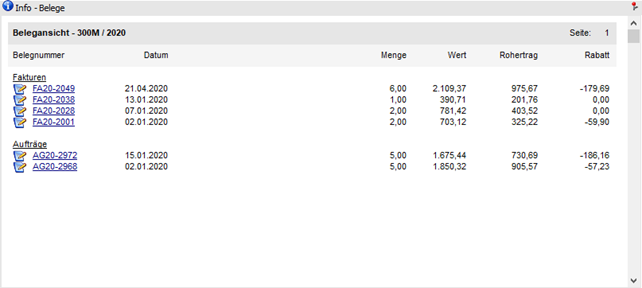 In der Ansicht "Belegansicht" werden für jede Belegstufe die einzelnen Belege in Summe aufgelistet und zusätzlich die Informationen "Belegnummer", "Datum", "Wert", "Rohertrag" und "Rabatt" angezeigt.