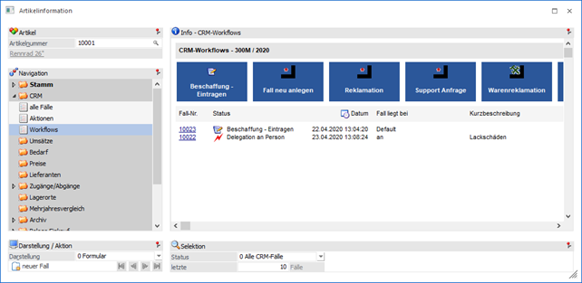 In der Ansicht "Workflows" werden die Fälle des aufgerufenen Artikels angezeigt, für welche der angemeldete Benutzer das Recht hat, sie zu sehen. Die Darstellung kann hierbei in Form einer Formularansicht oder als Tabelle erfolgen.
