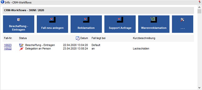 Durch Anwählen dieses Buttons kann ein weiterer CRM-Fall gestartet werden. Dabei stehen maximal 5 Workflows direkt zur Auswahl und ein weiterer Eintrag mit der Bezeichnung "Auswahl", über welchen das Fenster "Neuer Fall" aufgerufen werden kann.