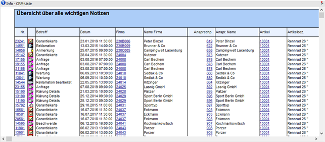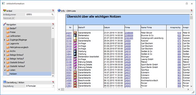 An dieser Stelle wird die CRM-Liste dargestellt. Die Art der Anzeige kann mit Hilfe der Option "Darstellung" gewählt werden.