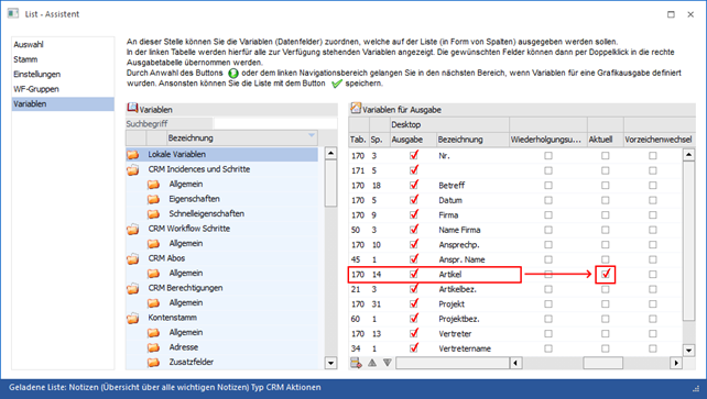 In diesem Bereich werden alle WinLine LIST-CRM-Listen angezeigt, bei denen das Feld "Artikelnummer" aus der CRM-Tabelle (Tabelle 170, Variable 14) mit der Option "Aktuell" versehen ist.