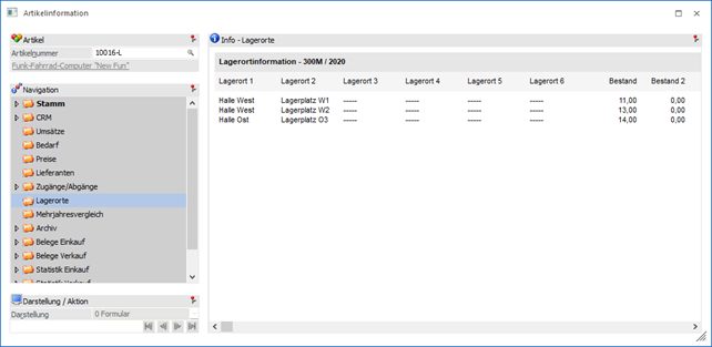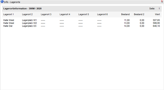 In dem Bereich "Lagerorte" werden die Lagerorte mit Bestand für den ausgewählten Artikel ausgewiesen.