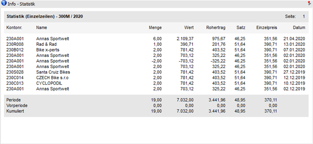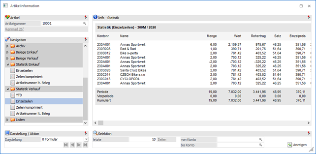 In der Ansicht "Einzelzeilen" werden die einzelnen Statistikzeilen des Artikels ausgegeben.