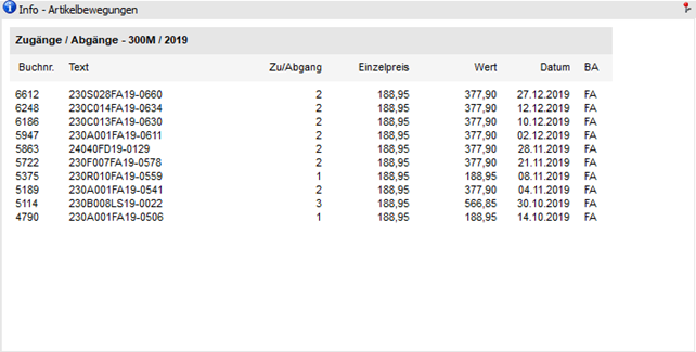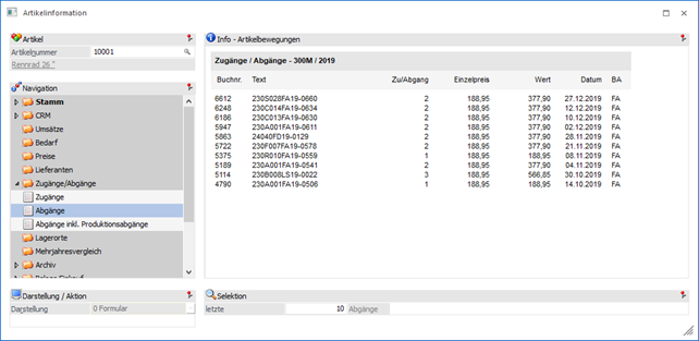 An dieser Stelle werden die Artikelbewegungen (Abgänge), gemäß der nachfolgenden Selektion, dargestellt.