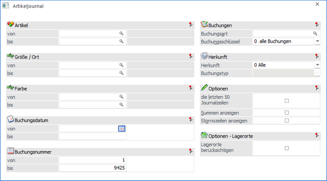 In dem Feld "Buchungsart" kann die Buchungsart eingetragen werden, welche im Artikeljournal ausgewertet werden soll. Ohne Eingabe werden alle Buchungsarten ausgewertet.
