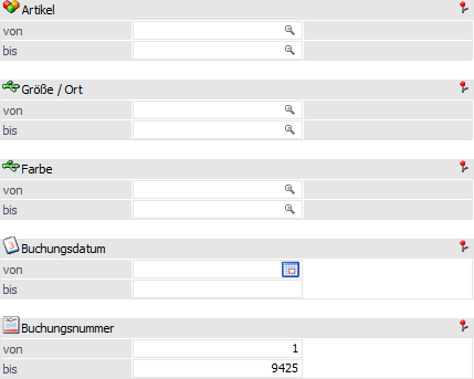 An dieser Stelle kann nach den Artikeln eingeschränkt werden, welche ausgewertet werden sollen. Bleiben die Felder leer so werden alle Artikel in die Auswertung einbezogen.