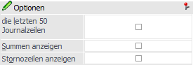 Im Bereich "Optionen" können weitere Einstellungen für die Ausgabe vorgenommen werden. Hierbei werden die gewählten Einstellungen der Optionen "die letzten 50 Journalzeilen" und "Stornozeilen anzeigen" benutzerspezifisch gespeichert.
