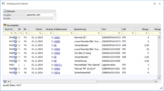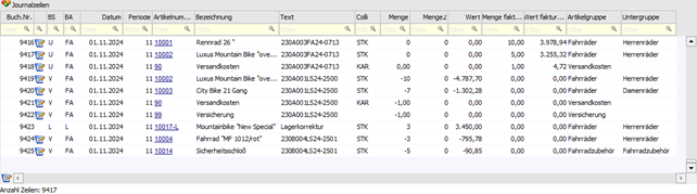 Die Basis der Journalzeilen in der Tabelle bildet immer die Selektion im Artikeljournal. D.h. in der Tabelle kann dieses Datenmaterial nur weiter eingeschränkt werden.