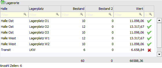 In der Tabelle werden, gemäß zuvor getroffener Selektion, alle Lagerorte mit Bestand angezeigt.