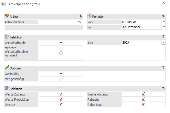 … erhält man eine Übersicht über die Artikelbewegungen, wobei die Auswertung auf Basis des aktuellen Wirtschaftsjahres oder auf Basis von mehreren Jahren durchgeführt werden kann.