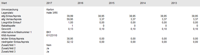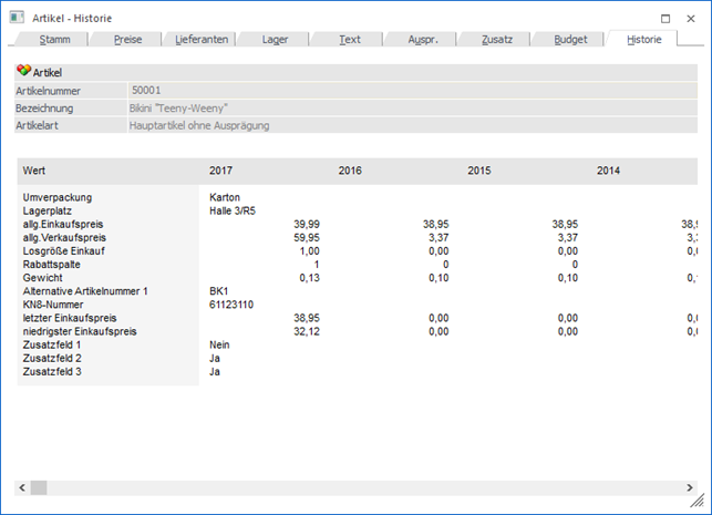 Sofern die Mandanten mit Mehrjahresinformationen geführt werden, wird in dem Register "Historie" der "Verlauf" von Artikeln angezeigt.