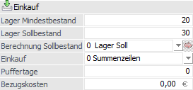 An dieser Stelle wird der Mindestbestand des Artikels hinterlegt. Wird der Mindestbestand unterschritten (unter Berücksichtigung aller bis zu einem bestimmten Stichtag noch fälligen Vorgänge), so ergänzt der automatische Bestellvorschlag die Lagermenge automatisch auf den "Lager Sollbestand".