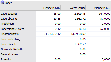 Das Unterregister "Lagerwerte" besteht aus einer Informationstabelle und gibt Auskunft über die aktuellen Lagerwerte.