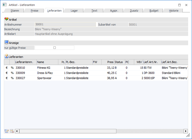 Im Register "Lieferanten" werden alle Lieferanten hinterlegt, bei welchen der Artikel bezogen werden kann (beliebig viele).