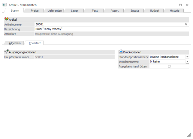 In dem Unterregister "Erweitert" stehen die Druckoptionen des Artikels zur Verfügung. Zusätzlich können die Grundeinstellungen für Ausprägungen definiert werden.