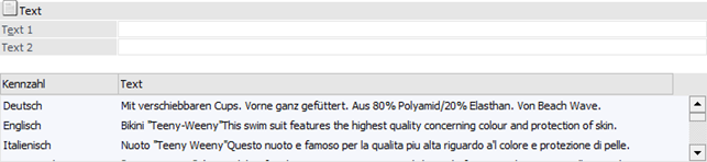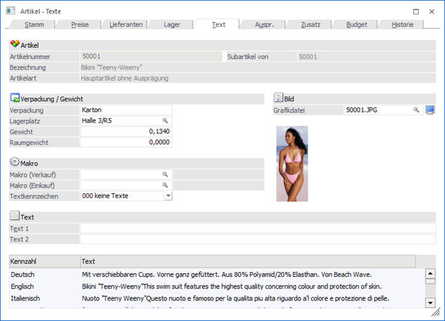 In dem Register "Text" können u.a. die Artikeltexte des Artikels hinterlegt werden.