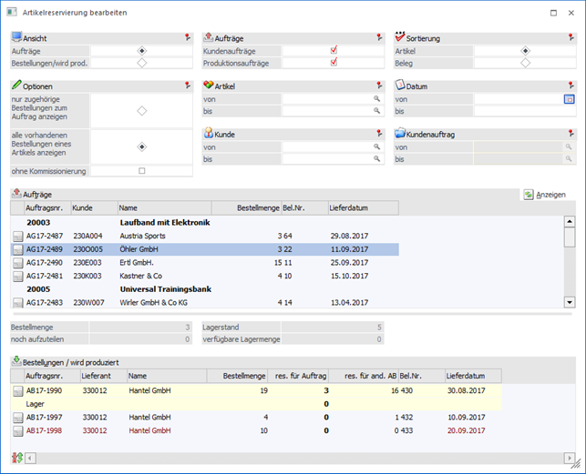 ü Kundenaufträge / Lieferantenbestellungen / Produktionsaufträge für welche bereits eine Reservierung von der Ausgangsmenge vorliegt (aufsteigend nach Lieferdatum / Produktionsdatum)