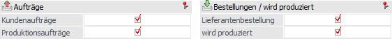 Mit Hilfe von Checkboxen kann definiert werden, ob Lieferantenbestellungen und / oder zu produzierende Produktionsaufträge angezeigt werden sollen.