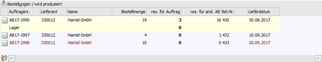 An dieser Stelle wird das Lieferdatum des Kundenauftrags / der Lieferantenbestellung / des Produktionsauftrags angezeigt. Sollte das Datum kleiner dem Lieferdatum der Bedarfszeile der oberen Tabelle sein, so wird die Schrift der Zeile in Rot dargestellt.