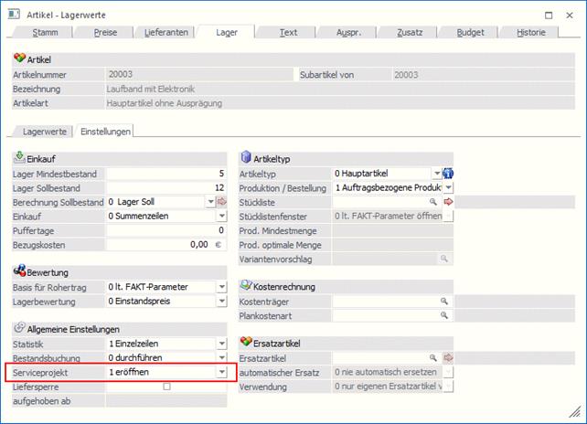 Jene Artikel, die in einem Serviceprojekt hinzugefügt werden sollen, müssen in den Stammdaten gekennzeichnet werden. Dies erfolgt im Reiter Lager im Feld Serviceprojekt: