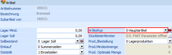 An dieser Stelle muss Typ "0 - Hauptartikel" eingetragen werden. Nur so ist sichergestellt, dass der Artikel im Zuge des Einkaufes beschafft wird, sobald für diesen ein Bedarf aus dem Bereich der Produktion gemeldet wird.