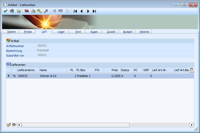 Zusätzlich müssen für den Einkauf im Register "Lieferanten" hinterlegt werden, wo der Artikel beschafft werden kann (nähere Informationen zu der Hinterlegung siehe Kapitel "Artikel - Lieferanten").