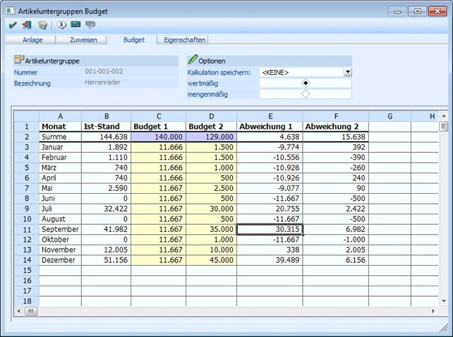 Durch Anklicken des Istwerte berechnen-Buttons werden die bestehenden Werte der Artikeluntergruppe errechnet.