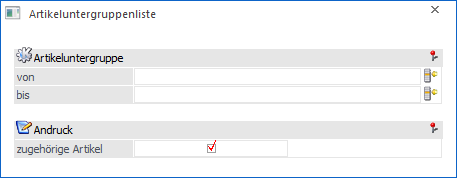 An dieser Stelle kann die Artikeluntergruppenliste auf einen bestimmten Artikeluntergruppenbereich eingeschränkt werden.