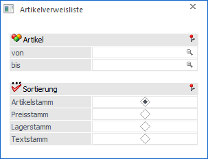 … kann die Artikelverweisliste ausgegeben werden, d.h. diese Stammdatenliste gibt eine Übersicht über die Verknüpfungen der Artikelstämme aus.