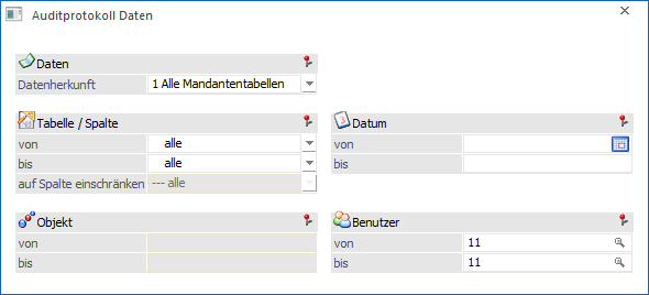 Mit Hilfe dieser Felder kann (nach Auswahl einer Tabelle) das auszuwertende Objekt, für welches das Audit-Protokoll ausgegeben werden soll, eingeschränkt werden (z.B. Kontonummer "230A001" bis "230B002").