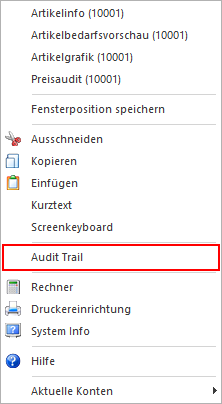 In jedem Eingabefeld eines Stammdatenfensters, für welches das Datenaudit aktiviert wurde, kann durch Anklicken der rechten Maustaste und Anwahl der Funktion "Audit Trail" das Datenaudit für dieses Eingabefeld abgerufen werden.