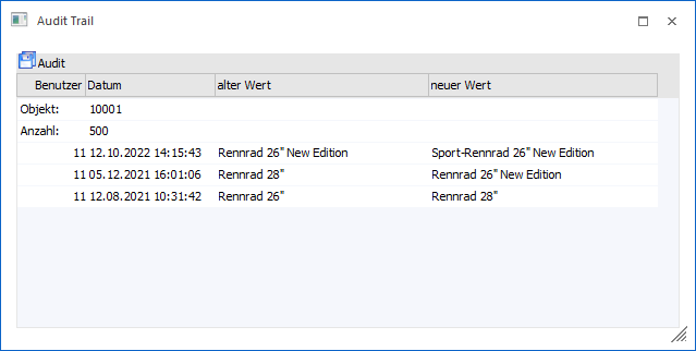 Neben der Benutzernummer und dem Änderungsdatum wird der "alte Wert" und der "neue Wert" angezeigt. Hierdurch lässt sich leicht nachvollziehen, wer wann welche Änderung durchgeführt hat.