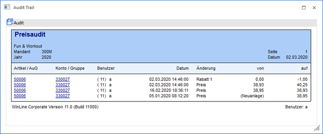 Neben dem Auditieren von Stammdaten steht in der WinLine die Möglichkeit zur Verfügung, alle Veränderungen am Preis protokollieren zu lassen. Auch dieses wird über das "Variablen Audit" (WinLine ADMIN - Audit - Variablen Audit - Tabelle "043 - Preisliste") aktiviert.