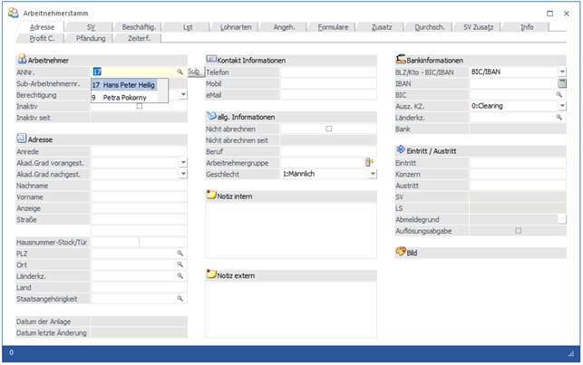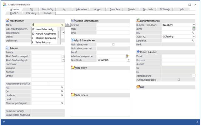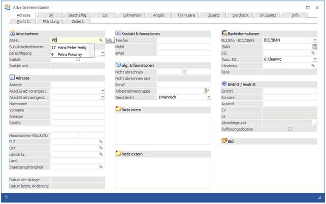 2.) Aufruf des Matchcodes mit der F9-Taste, wobei wahlweise vorher bereits ein Suchbegriff mit gegeben werden kann oder nicht (siehe auch Arbeitnehmerstamm Matchcode).