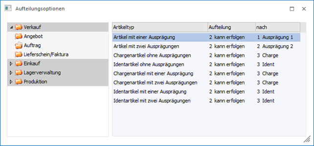 In den "Aufteilungsoptionen" kann definiert werden, wie und wann die Aufteilung von Hauptartikeln bzw. Lagerorten erfolgen soll.