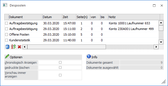 Die Ausdrucke, die sich im Spooler befinden, können zwar nicht mehr verändert, jedoch betrachtet, gedruckt und gemailt werden. Der Spooler an sich ist in jeder Applikation über den Menüpunkt