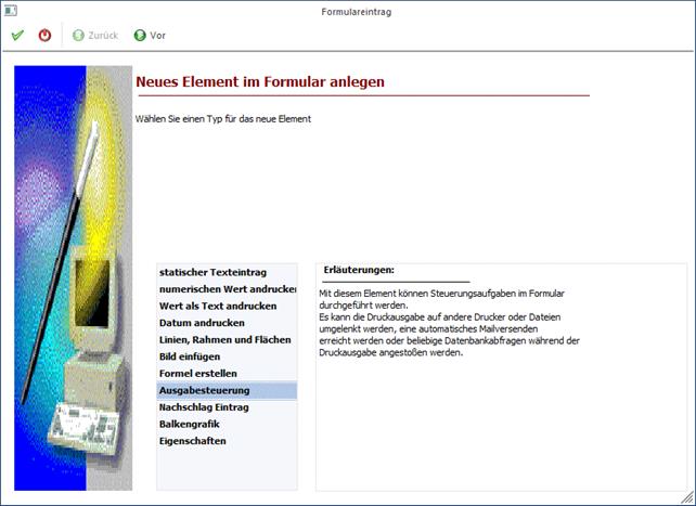 Bei der Auswahl des neuen Elements wird die Option "Ausgabesteuerung" ausgewählt.
