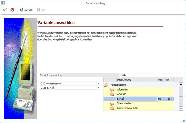 Durch Anklicken des VOR-Buttons kann entschieden werden, aus welcher Variable die E-Mail-Adresse geholt werden soll. Durch Anklicken des Zurück-Buttons kann eine andere Ausgabesteuerung gewählt werden.