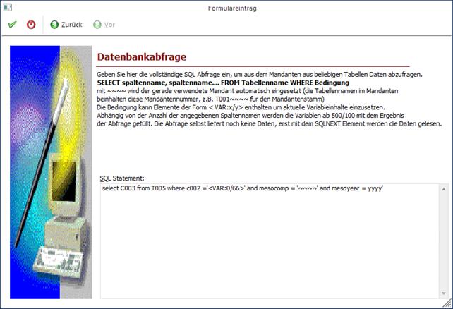 Mit dieser Funktion können im Formular Abfragen hinterlegt werden, deren Ergebnis dann am Formular angedruckt werden kann. Datenbankabfragen werden dann verwendet, wenn im Formular die gewünschten Daten nicht direkt zur Verfügung stehen.