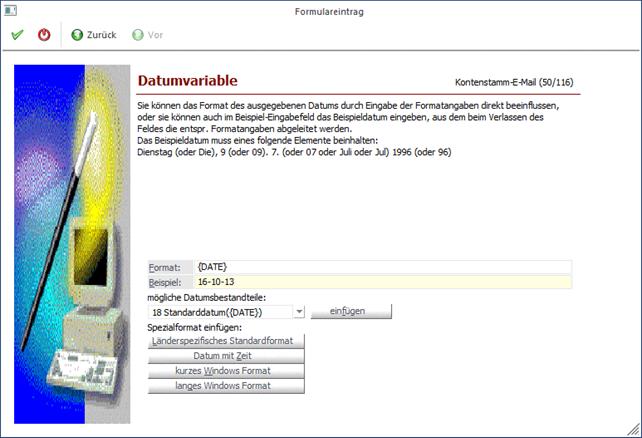 Aus der Auswahllistbox können Bestandteile des Datums ausgewählt werden, die durch Anklicken des Einfügen-Buttons in das Feld Format übernommen werden. Dabei ist darauf zu achten, an welcher Stelle der Cursor im Feld "Format" steht - denn dort wird die ausgewählte Option eingefügt. So kann ein individuelles Datumsformat zusammengestellt werden.