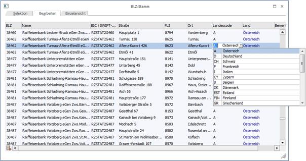 Die Anlage neuer Bankleitzahlen erfolgt im Register Bearbeiten durch Anklicken der nächsten freien Zeile.